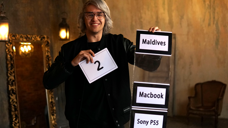 You ask a participant to choose the future for the world by displaying 5 boards with five numbers on it. The participant makes their selection, and you reveal to the audience what they selected which reads "PEACE," which is good thing of course.